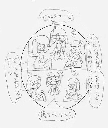 ガルルがギロロに抱きつき、ギロロはそのガルルから必死に逃げる。ケロロたちはガルルを恐れているので止められない。ガルル小隊もしかり、それを見て、アクアクはなぜかイラついた。理由はわからない。けどイラついたのは事実だ。